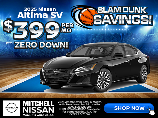 2025 Altima SV for $399 a month with Zero down. for 84 months WAC. N25426. VIN: 1N4BL4DV6SN419186. Offer expires 3/31/26.